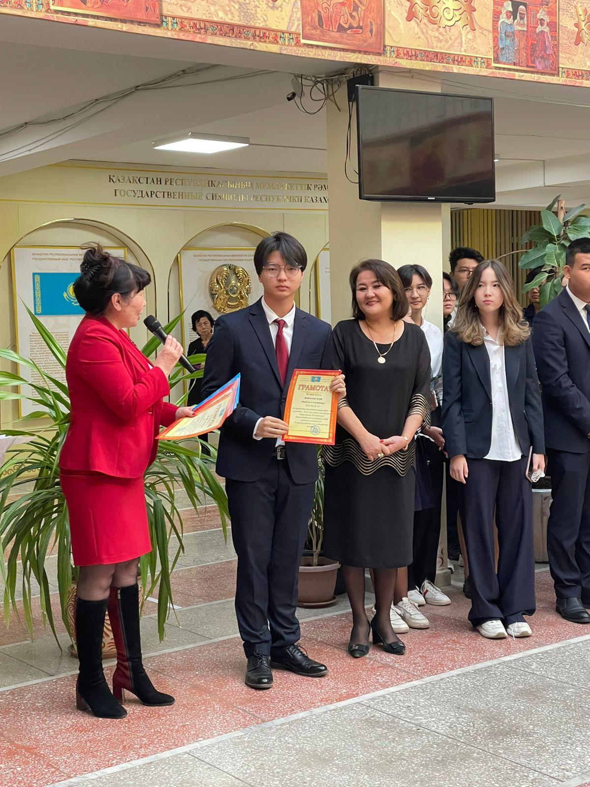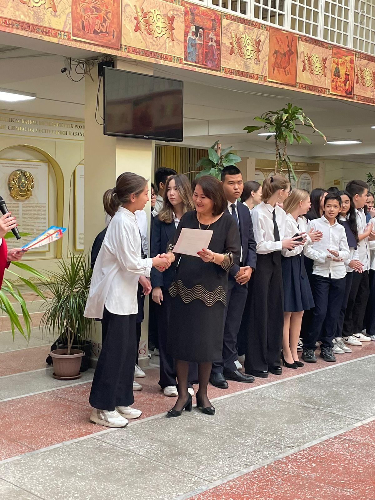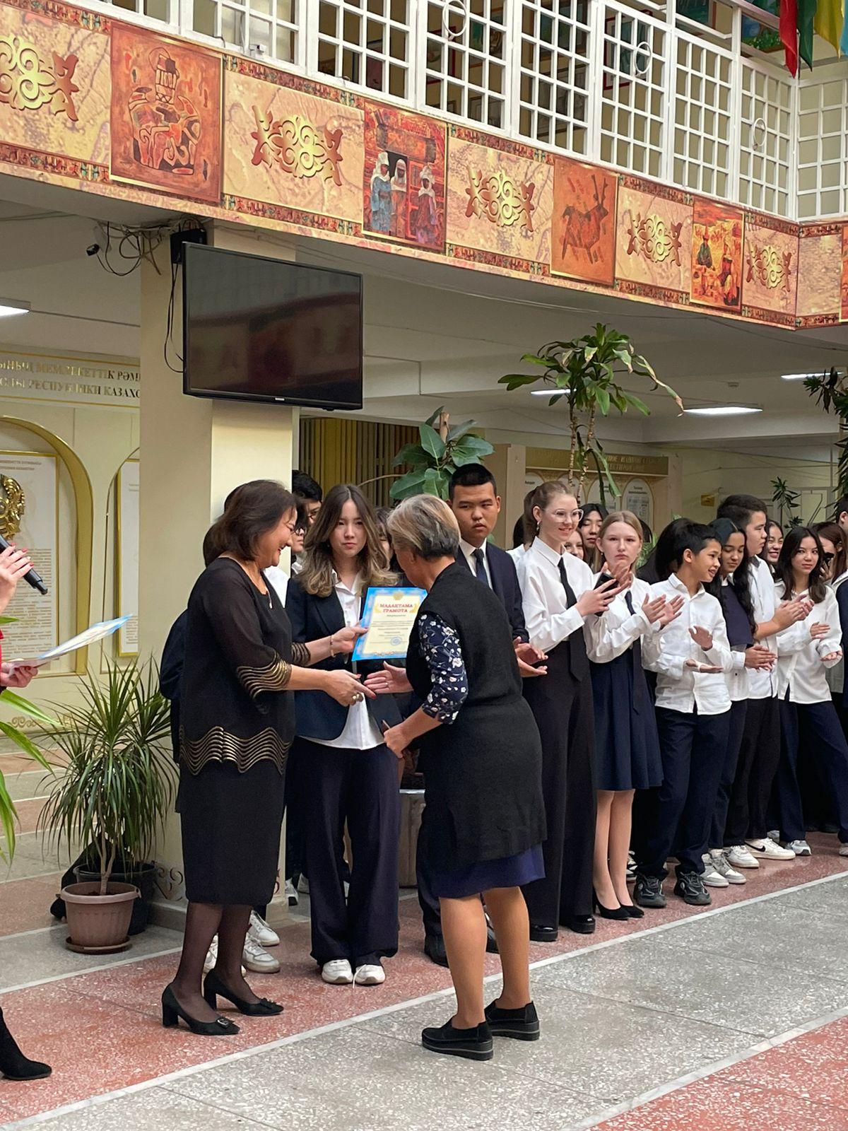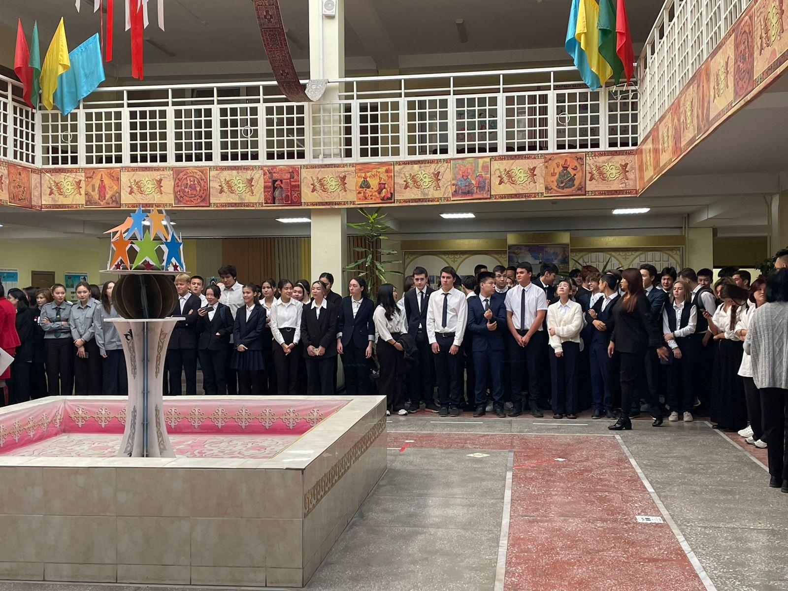 #117 ЖББМ 2022 ж 21 қазан айында Республика күніне орай салтанатты жиын өтті. Салтанатты жиынды Мемлекеттік әнұранмен ашты. Салтанатты жиынға 9-10-11 сынып оқушылары қатысып,әрі пән бойынша олимпиада мен спорттық жарыстардан орын алған оқушыларды марапаттады