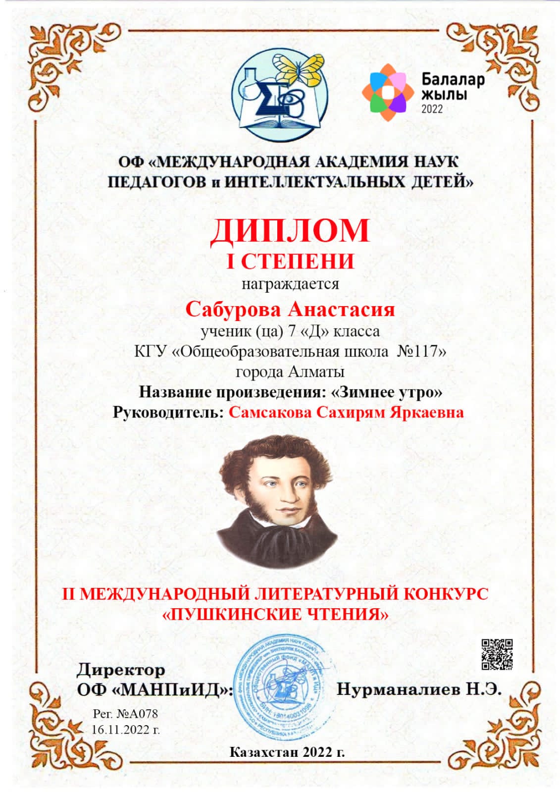 "Пушкин оқулары" 2-ші халықаралық әдеби байқауында І, ІІ дәрежелі дипломдармен марапатталған оқушыларымызды құттықтаймыз!