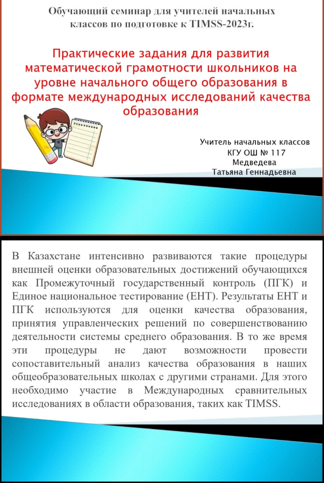 Медведева Татьяна Геннадьевна 21 қарашада "Білім беру сапасын халықаралық зерттеу форматында бастауыш жалпы білім беру деңгейінде оқушылардың математикалық сауаттылығын дамытуға арналған практикалық тапсырмалар" тақырыбында онлайн форматта қалалық семинар өткізді.