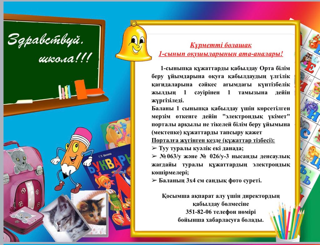 29 март 2023 0 1 2 3 4 5 Құрметті болашақ 1-сынып оқушыларының ата-аналары!!! 1-сыныпқа құжаттарды қабылдау Орта білім беру ұйымдарына оқуға қабылдаудың үлгілік қағидаларына сәйкес ағымдық күнтізбелік жылдың 1 сәуірінен 1 тамызына дейін жүргізіледі. Осы беттің QR-коды:QR-код этой страницы: