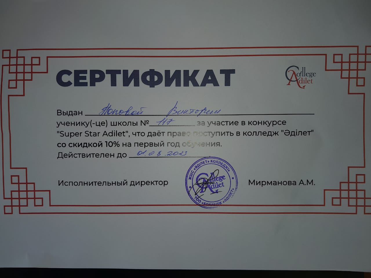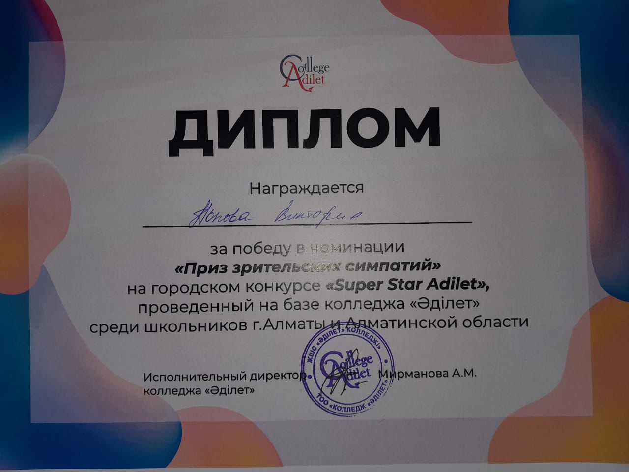 28 апрель 2023 0 1 2 3 4 5 Құттықтаймыз!🏆🏆🏆 Попова Виктория 9 "Е" сынып оқушысы "Әділет"колледжінде өнер көрсетті, қатысқаны үшін Диплом және сертификатпен марапатталды. Құттықтаймыз!🏆🏆🏆 Осы беттің QR-коды:QR-код этой страницы: