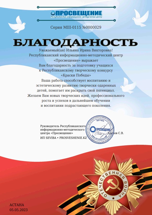 10 май 2023 0 1 2 3 4 5 Құттықтаймыз!🏆🏆🏆 8 сынып оқушысы Әбікеева Тамиристі, сондай-ақ оның жетекшісі Ильина Ирина Викторовнаны "Жеңіс бояулары" Республикалық шығармашылық байқауына қатысып, үшін 1 дәрежелі диплом жүлдесін иеленуімен құттықтаймыз!🏆🏆🏆 Осы беттің QR-коды:QR-код этой страницы: