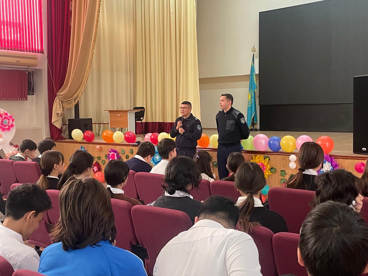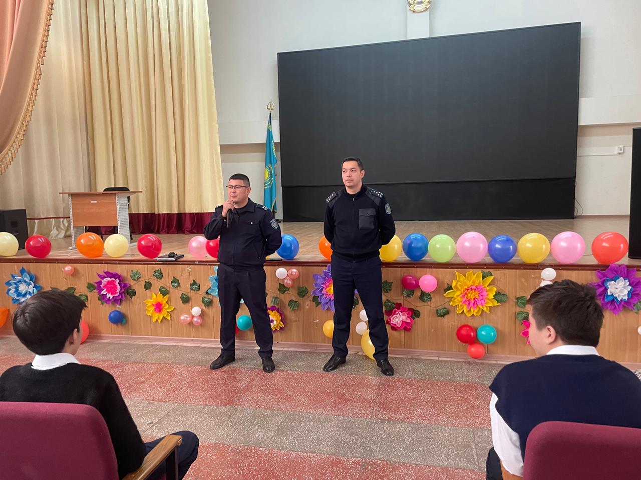 Әуезов ауданы ПБ бастығының орынбасары полиция подполковнигі Д. А. Майлықбаев пен Әуезов ауданы ПБПҚ ювеналды полициясының бастығы полиция капитаны А. Р. Жұмабаев ҚР Қылмыстық және әкімшілік кодексін түсіндіру, кәмелетке толмағандардың қылмыстық және әкімшілік іс-әрекеттер жасағаны үшін жауапкершілігі, азаматтық құқықтық сананы қалыптастыру, өз құқықтары мен міндеттерін білу қажеттілігі, сондай-ақ Қазақстан Республикасының Қылмыстық және әкімшілік кодексін балалар зорлық-зомбылықтың құрбаны бола алмайды.