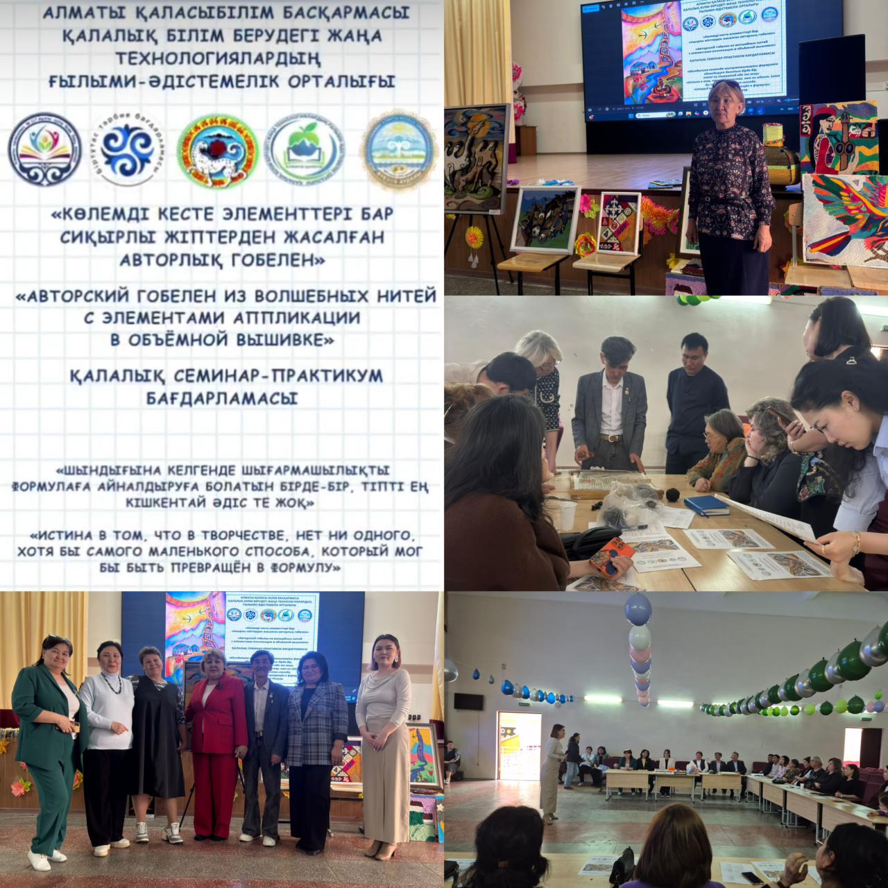 Семинарда Алматы қаласының көркем еңбек мұғалімдері әртүрлі техникада гобелен жасаудың мастер‑кластарына көрсетіп өтті. Әріптестерге авторлық гобелен жасау кезіндегі бірнеше амалдар мен нәзіктіктер көрсетілді. Әр шебер өз құпиясымен бөлісті. Барлығы қарым‑қатынас пен тәжірибе алмасудан, білім бөлісу мен игеруден пайда мен қуаныш алды. Қалалық семинар, әдеттегідей, жоғары деңгейде ұйымдастырылды.