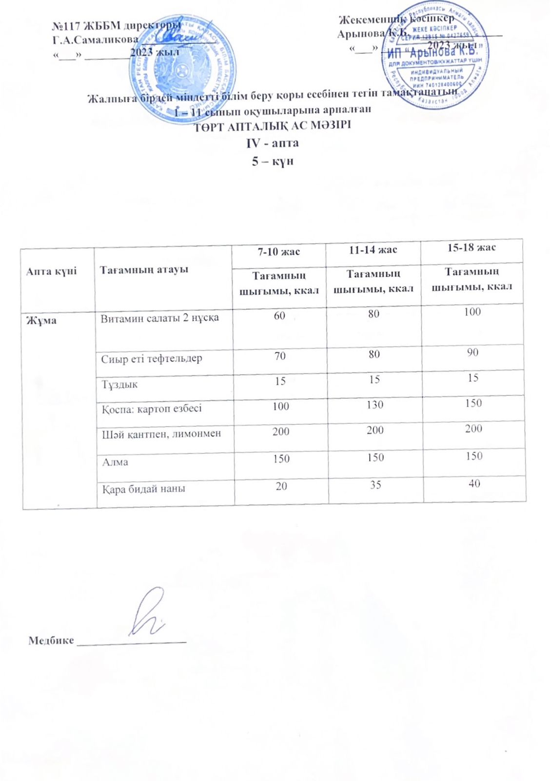2 апта ас мәзірі
