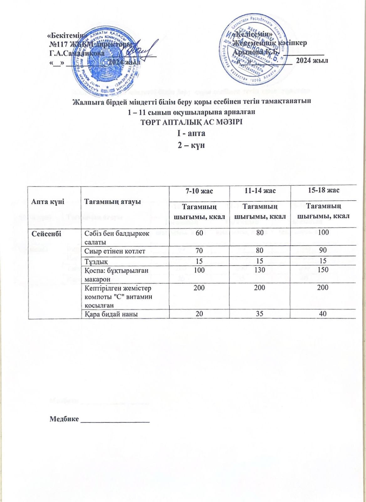 2 апта ас мәзірі