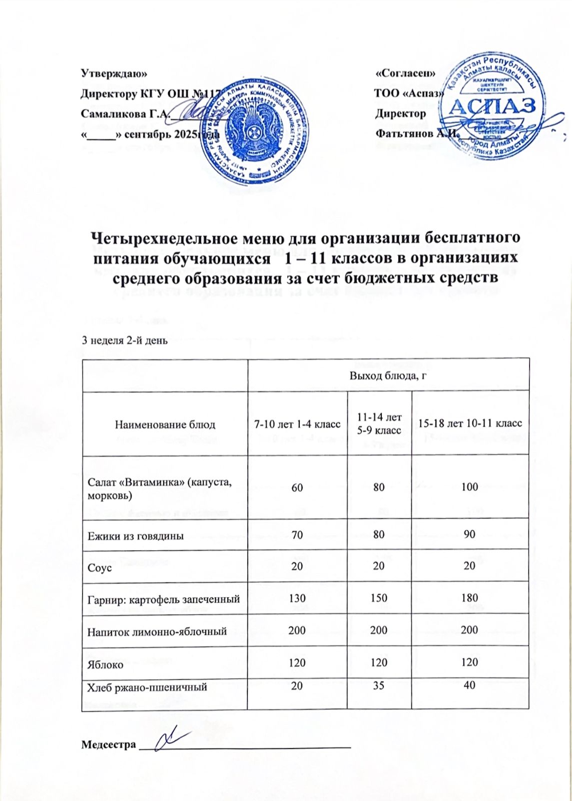 2 апта ас мәзірі