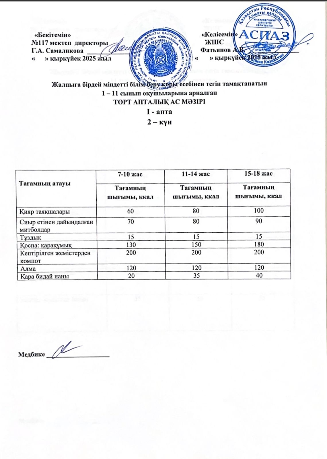 2 апта ас мәзірі