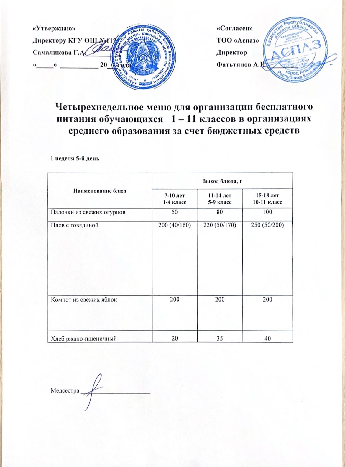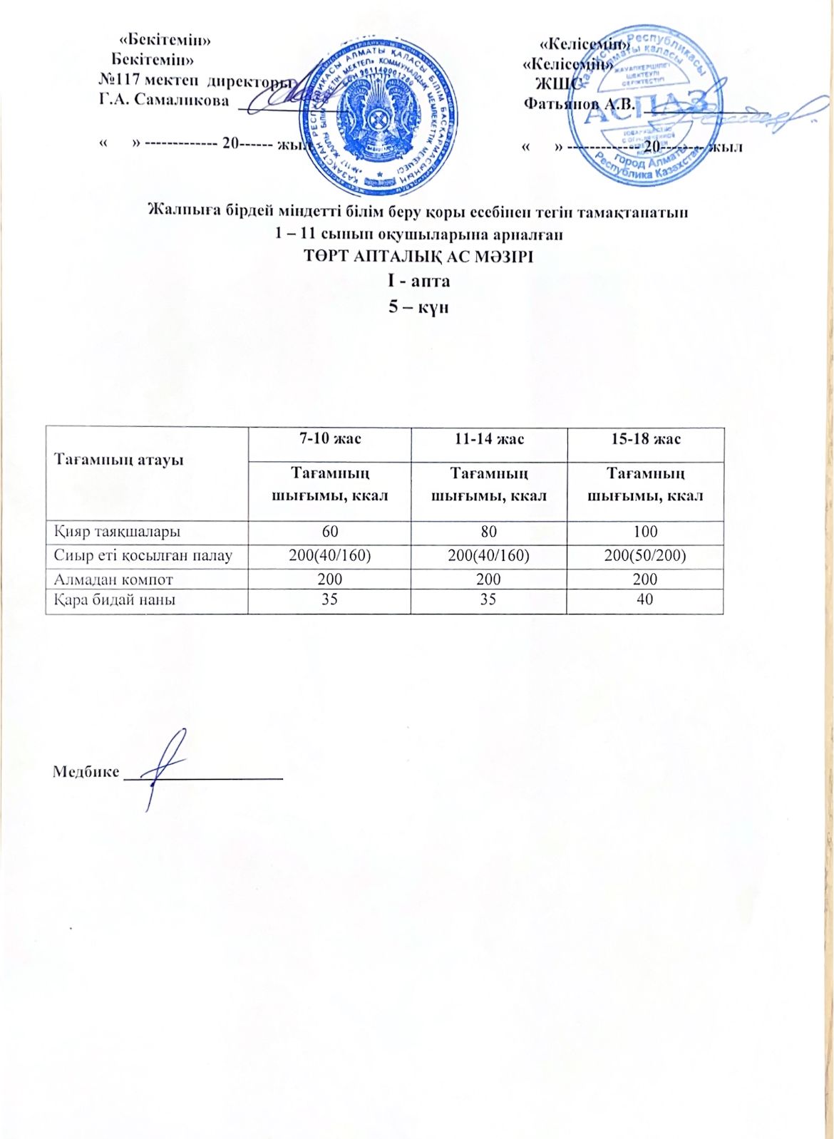 2 апта ас мәзірі