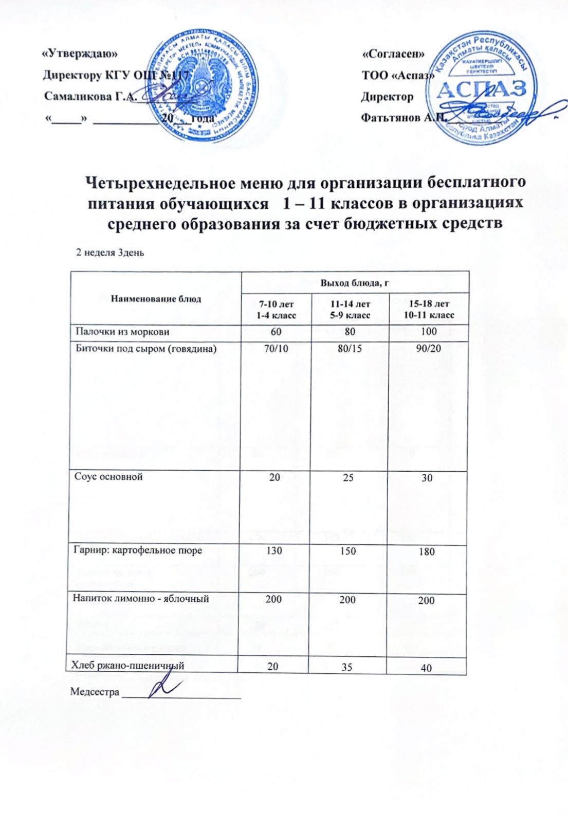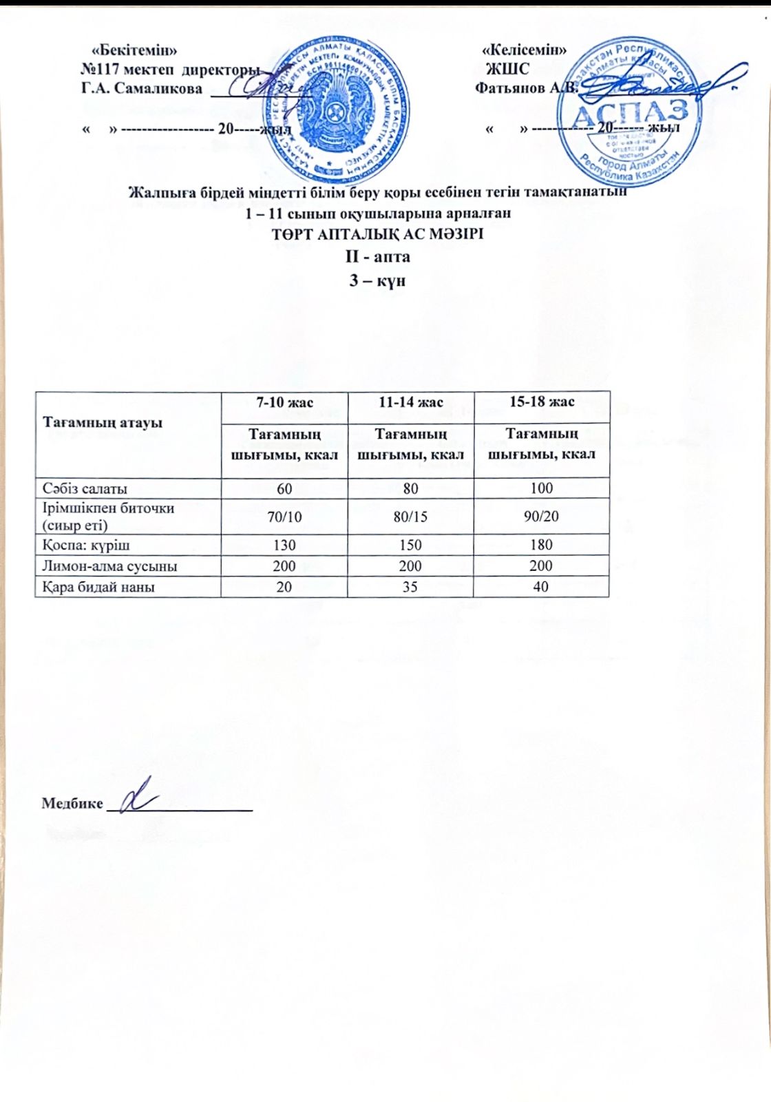 2 апта ас мәзірі