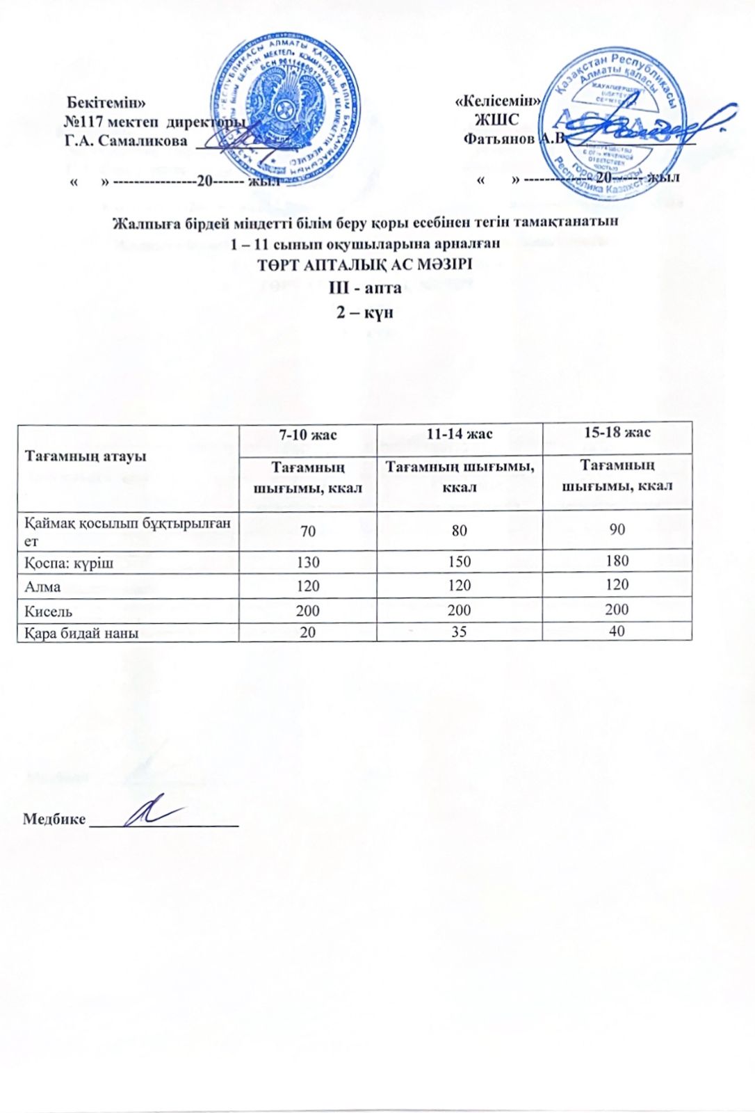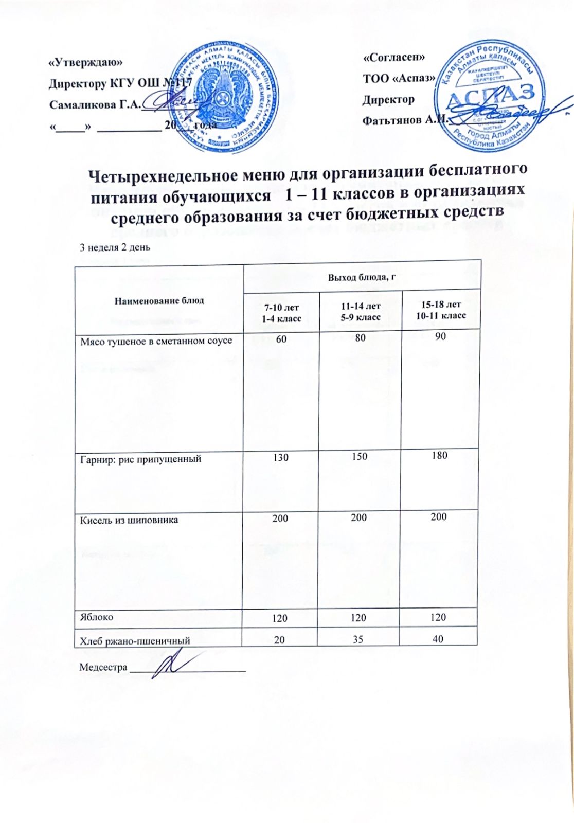 2 апта ас мәзірі