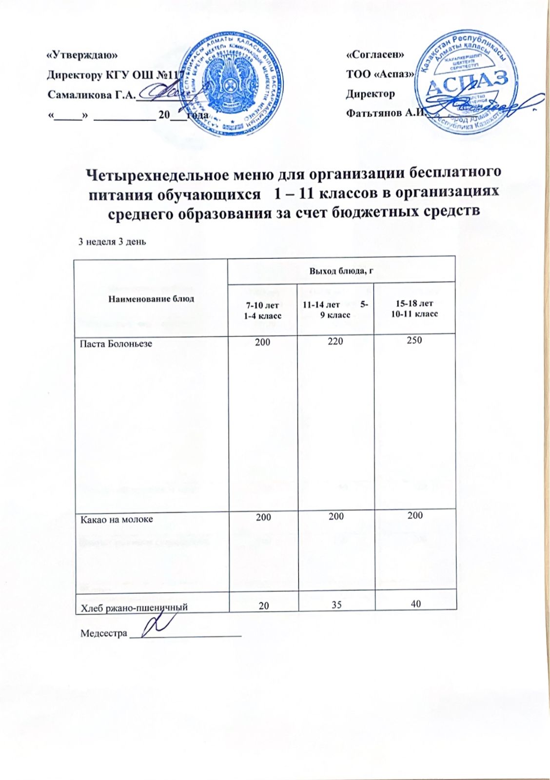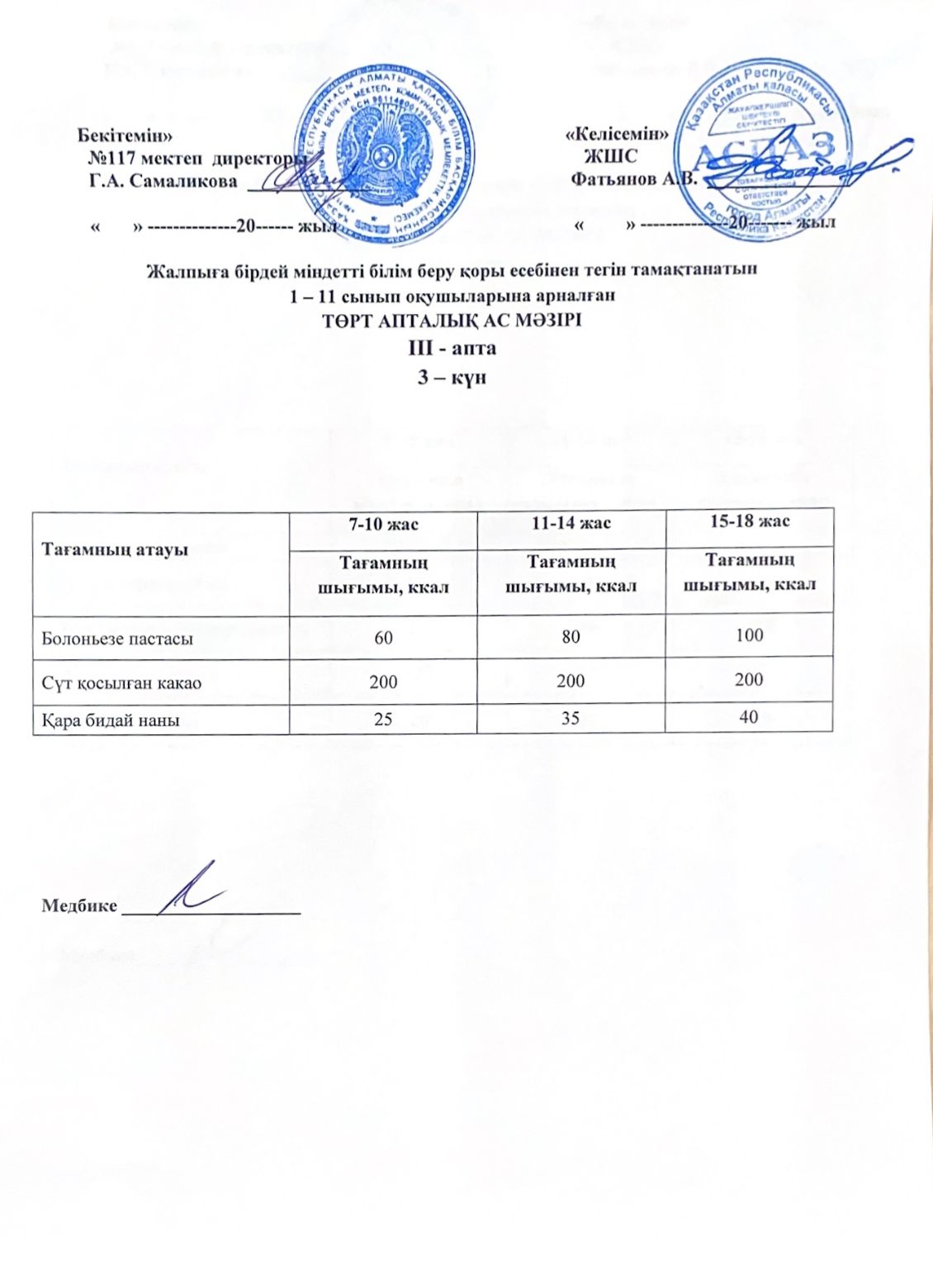 2 апта ас мәзірі