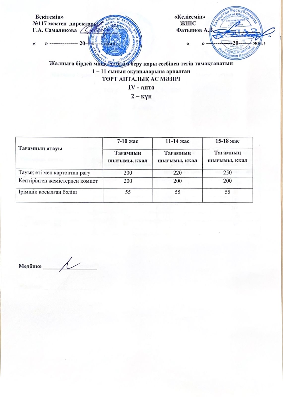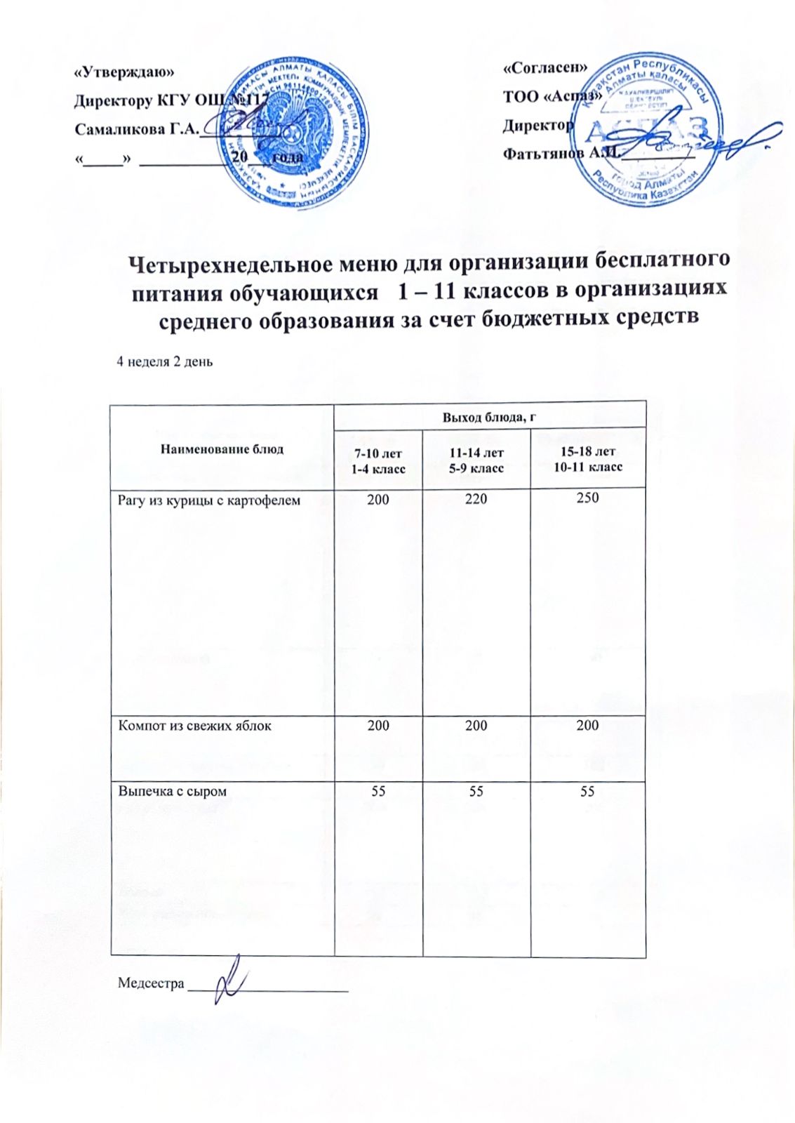 2 апта ас мәзірі